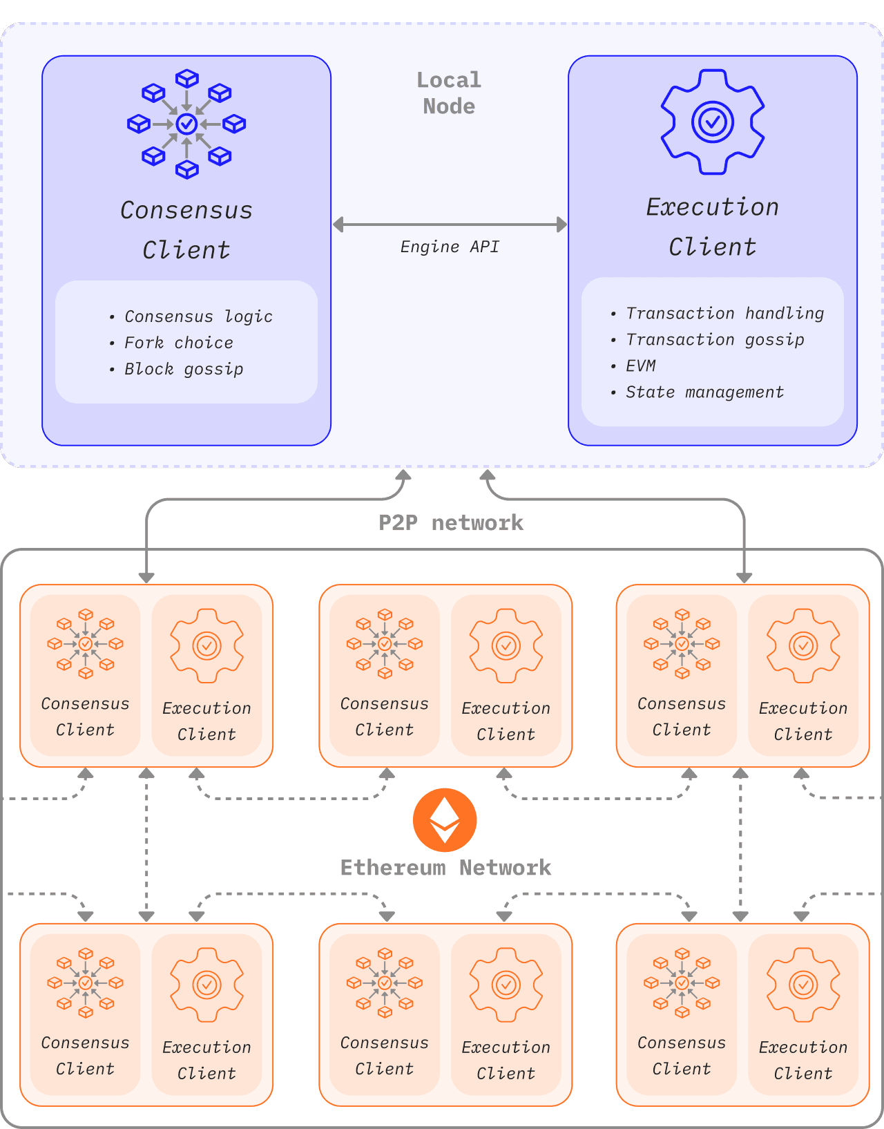 The diagram below shows the relationship between the two Ethereum clients. The two clients connect to their own respective peer-to-peer (P2P) networks. Separate P2P networks are needed as the execution clients gossip transactions over their P2P network, enabling them to manage their local transaction pool, whilst the consensus clients gossip blocks over their P2P network, enabling consensus and chain growth.